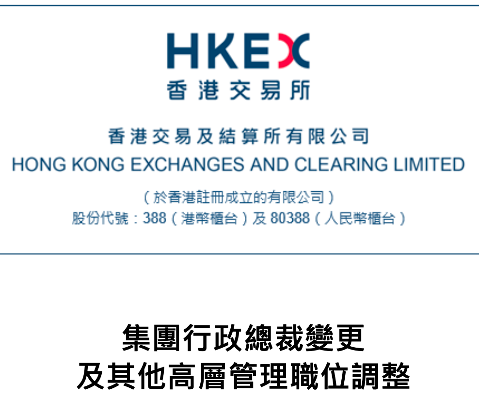 港交所此前宣布,任命陈翊庭为下一任集团行政总裁,任命姚嘉仁为港交所集团副行政总裁,任命刘碧茵为港交所联席营运总监,均自2024年5月24日起生效。